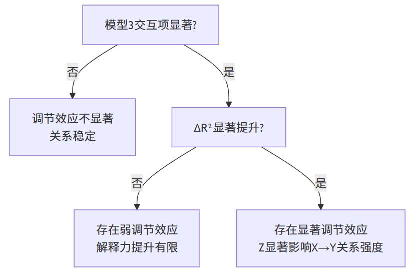 - 若ΔR²显著提升,说明加入交互项后模型更优;