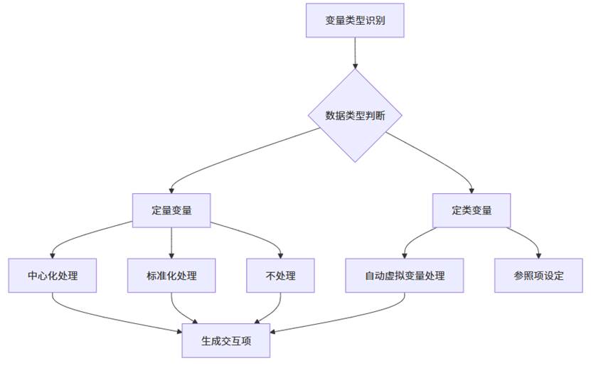 SPSSAU的智能化之处在于能够自动识别变量类型并推荐最合适的处理方式。对于定量变量,平台默认采用中心化处理,这有助于减少多重共线性问题,使得回归系数的解释更加直观。