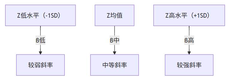 - 若交互项不显著,则关系稳定,不受Z调节。