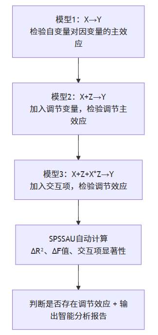 在 SPSSAU 中,调节效应分析遵循经典的 多层回归模型逻辑。系统通过三步(模型1、模型2、模型3)逐步引入变量,自动计算模型变化与显著性。