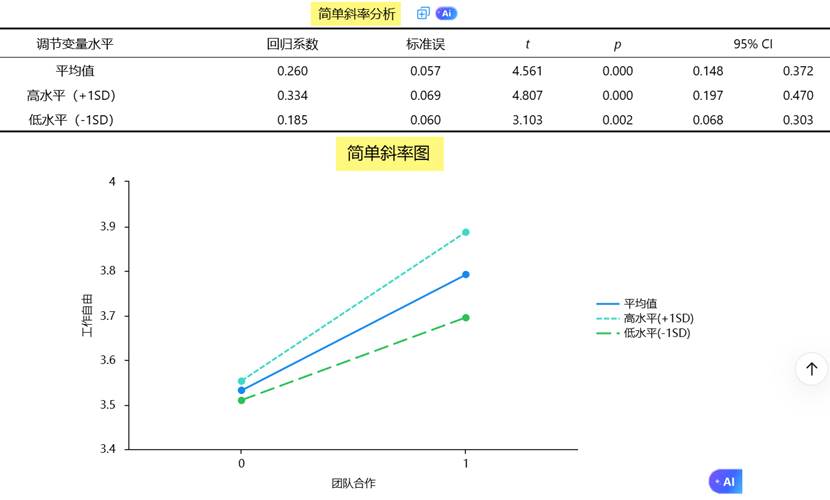 SPSSAU 会自动生成“简单斜率表”与“斜率图”,帮助直观理解这种“随着Z变化而变化的X→Y关系”。