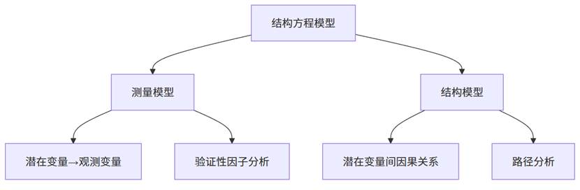 结构方程模型是一种建立、估计和检验因果关系模型的分析方法。它包含测量模型和结构模型两部分:测量模型描述潜在变量与观测指标之间的关系,而结构模型则描述潜在变量之间的因果关系。