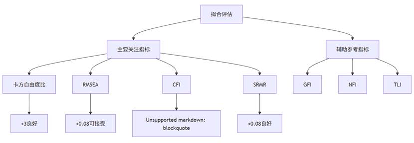 - RMSEA(近似误差均方根):评估模型复杂度与误差;