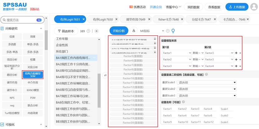 这一流程体现了SEM分析的系统性和迭代性特点。SPSSAU平台将这一复杂过程自动化,大大降低了用户的技术门槛。SPSSAU软件进行SEM模型操作示例如下图: