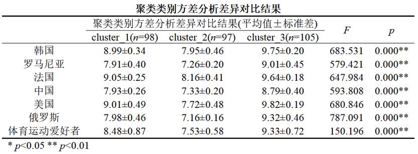 聚类之后,SPSSAU 会自动进行“聚类类别方差分析差异对比”,通过比较不同群体在各个变量上的均值差异,判断每个群体的显著特征。
