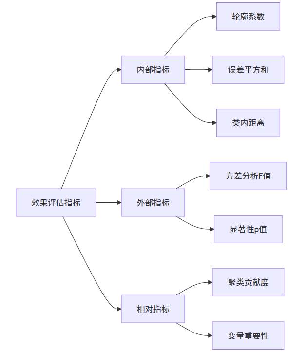 聚类分析涉及多类统计指标,它们共同构成了完整的聚类效果评估体系。以下是这些指标的系统分类: