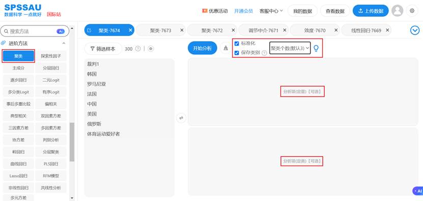 这种智能化算法选择确保了各种数据类型都能获得最合适的聚类处理方案。SPSSAU进行聚类分析页面如下: