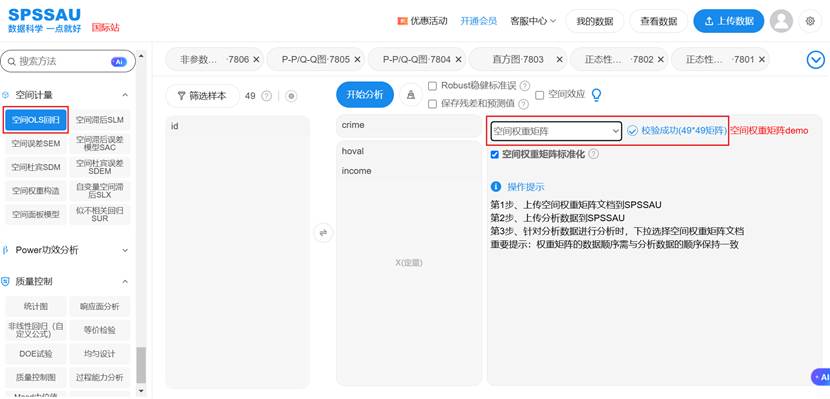 SPSSAU【空间计量】模块选择【空间OLS回归】,操作如下图: