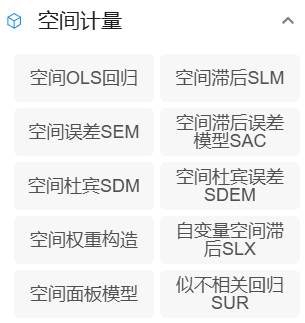 每种模型都有其特定的数学表达形式和适用条件,研究者需要根据具体研究问题和数据特征选择合适的模型。SPSSAU【空间计量】模块提供方法示例如下: