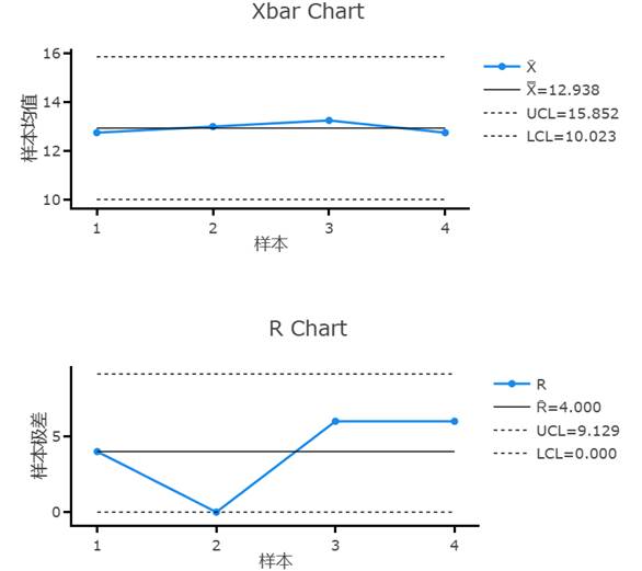 点击“开始分析”,SPSSAU将在瞬间完成所有计算,并输出包括Xbar控制图和R控制图在内的一系列结果。示例图如下: