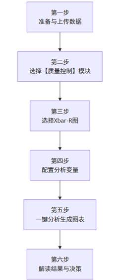 由于我们的数据是连续的计量值,且子组大小恒定(n=5),根据前面的选型指南,应选择“Xbar-R图”。SPSSAU界面友好,提供了清晰的控制图分类和说明。