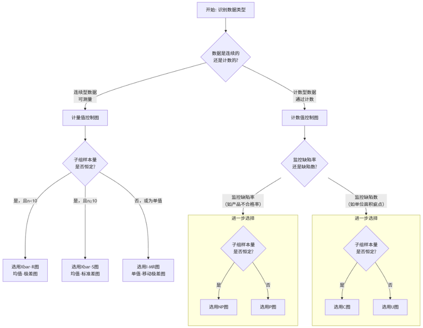 质量控制图选型指南。该流程图清晰地展示了如何根据数据的本质(计量/计数)和样本特点,一步步选择最合适的控制图类型。SPSSAU平台内置了此逻辑,能根据用户数据自动推荐或适配相应的控制图。