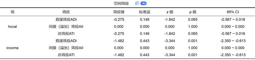 尽管SLX模型的系数已可直接解读,SPSSAU也可输出一张“空间效应”表格。