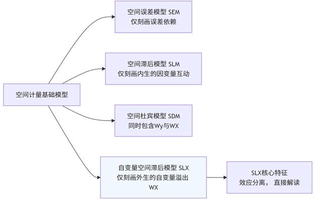 SLX模型在空间计量模型家族中占据着一个独特而清晰的位置,其与核心模型的逻辑关系如下图所示: