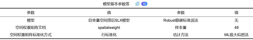 它明确宣告了本研究采用的模型是“自变量空间滞后SLX模型”,并列出了所依据的空间权重矩阵、其标准化方式、样本量以及估计方法(如极大似然法ML)。这些信息是评估研究设计严谨性的首要依据。