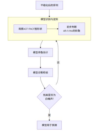 - 模型识别:通过观察平稳序列的ACF和PACF图的截尾/拖尾特性,初步判断p和q的值。