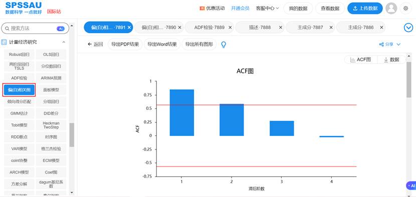 - 偏自相关图:在剔除中间变量影响后,揭示序列与特定滞后项之间的“纯粹”相关性。ACF和PACF图是识别模型类型的关键工具。SPSSAU【计量经济研究】模块提供【偏(自)相关图】,直接输出ACF和PACF图: