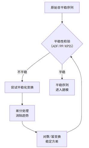 - 变换:若序列方差随时间增大(异方差),可先进行对数变换或Box-Cox变换,以稳定方差。