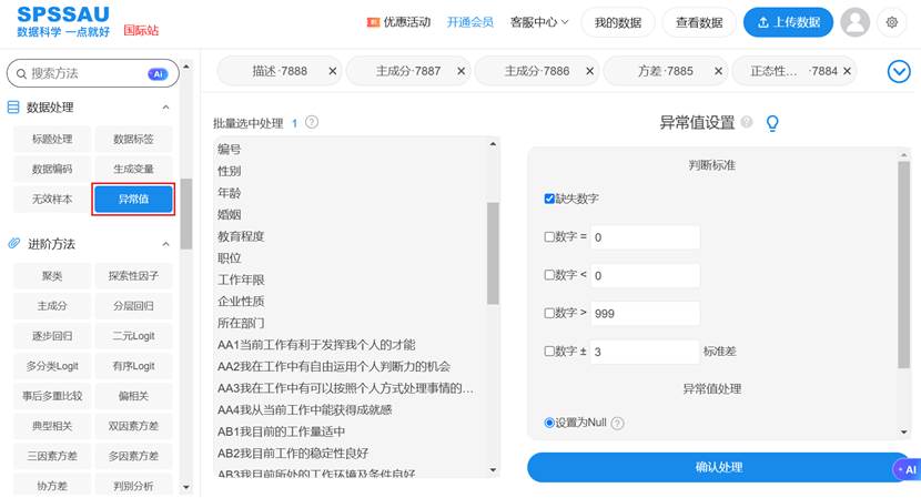 在这一步,利用SPSSAU的【数据处理】功能,可以快速完成缺失值、异常值的识别与处理,为后续分析奠定坚实的数据基础。操作示例如下: