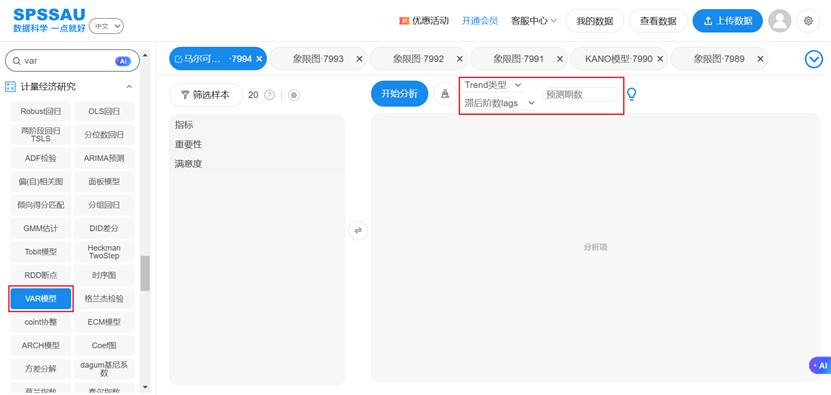SPSSAU 的 VAR 模块集成 ADF、AIC/BIC、IRF、FEVD 等常见分析步骤,支持从“建模—解释—预测”一站式输出。
