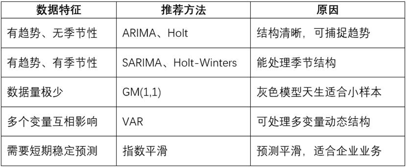 ARIMA/SARIMA 注重线性结构,指数平滑注重分解结构,灰色模型注重小样本预测,而 VAR 注重多变量的动态互动。
