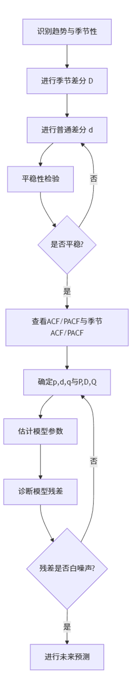 SARIMA 在 ARIMA 的基础上增加了季节维度,因此建模时不仅看 ACF/PACF,也要看季节滞后点(如 lag=12)的峰值。季节差分与普通差分交替进行,使序列在趋势与季节性两个维度均平稳。