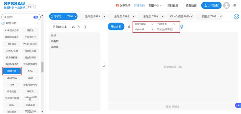 SPSSAU 的指数平滑模型如果不设置平滑方法,SPSSAU会自动遍历不同组合的平滑方法,找出最优效果时对应的平滑方法;如果不设置初始值S0,SPSSAU自动按照样本量情况设置初始值S0;如果不设置平滑系数alpha,SPSSAU自动遍历各种alpha取值情况,并且选择最优效果时对应的alpha值。