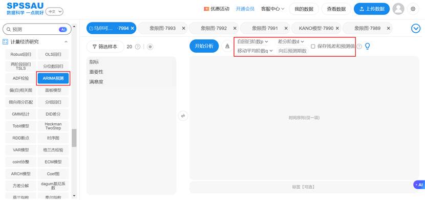 如果你使用 SPSSAU,它能覆盖文中所有模型,可直接进行平稳性检验、差分、ACF/PACF 绘图、残差诊断、模型参数估计与未来预测,适合做论文、课题研究、业务预测等。