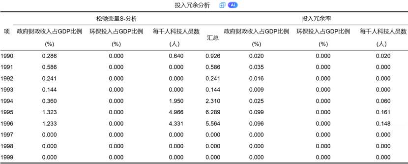 - 投入冗余率:各投入要素的松弛变量与实际投入值的比率,反映投入过剩的相对程度。