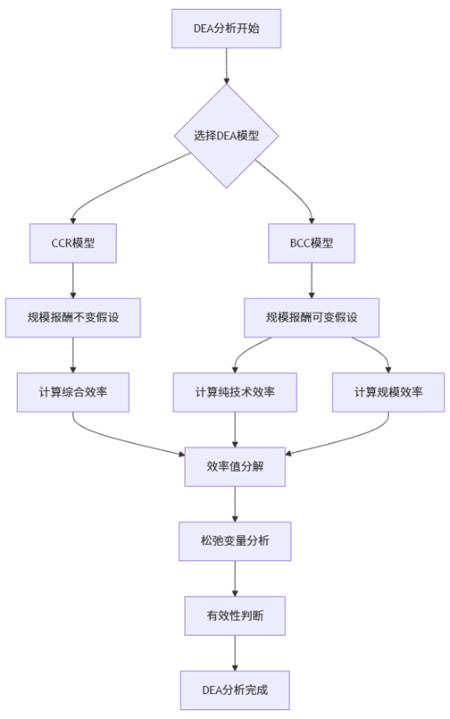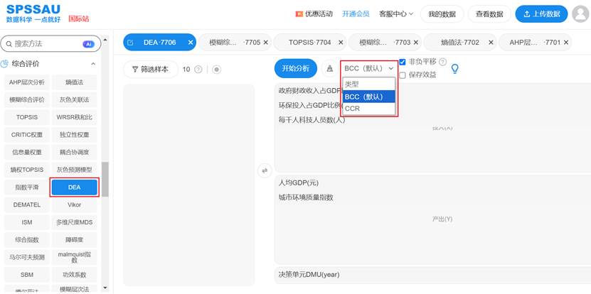 如上图所示,DEA分析主要包括模型选择、效率计算、松弛分析和有效性判断四个关键环节。SPSSAU平台支持CCR和BCC两种经典模型,用户可根据研究需要灵活选择。