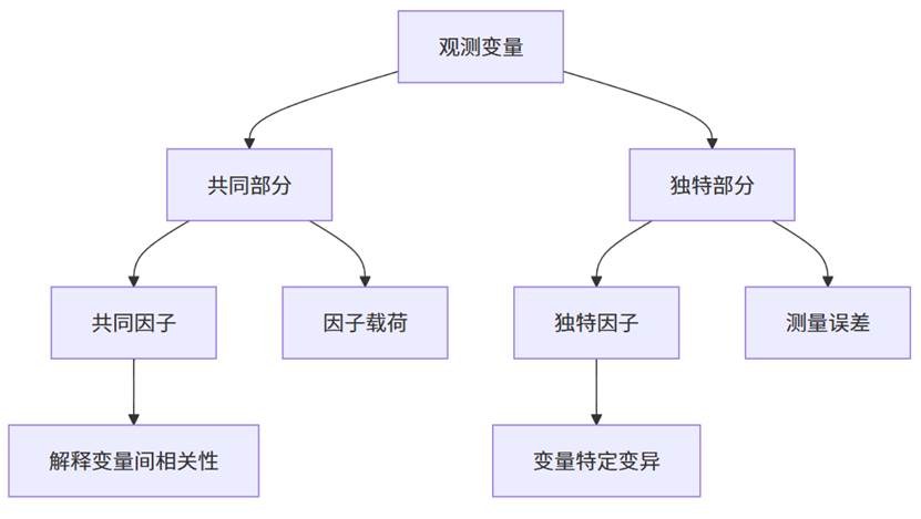 因子分析基于"共同因子模型",认为每个观测变量都可以表示为共同因子和独特因子的线性组合。因子分析的理论模型示意图如下图,展示观测变量如何被分解为共同部分和独特部分,共同部分由潜在因子解释。