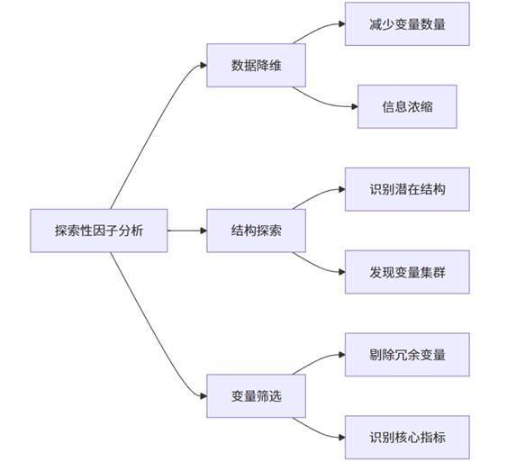 上图展示了探索性因子分析的三个主要目的,包括数据降维、结构探索和变量筛选,帮助研究者从大量变量中提取核心信息。