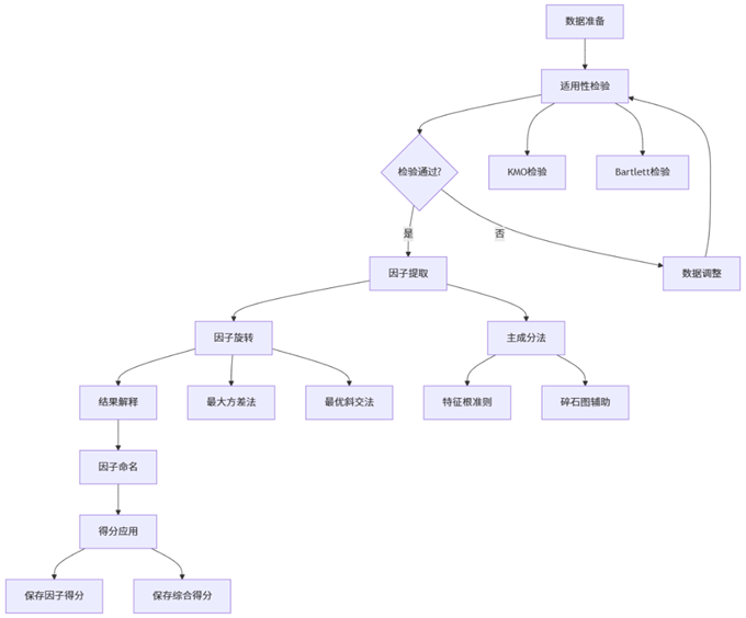 上图展示了SPSSAU中探索性因子分析的完整工作流程,从数据准备到结果应用的六个关键步骤,确保分析的系统和规范。