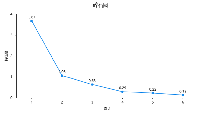 碎石图用于辅助判断因子提取个数,当拆线由陡峭突然变得平稳时,陡峭到平稳对应的因子个数即为参考提取因子个数。碎石图仅辅助决策因子个数,实际研究中更多以专业知识,结合因子与研究项对应关系情况,综合权衡判断得出因子个数。