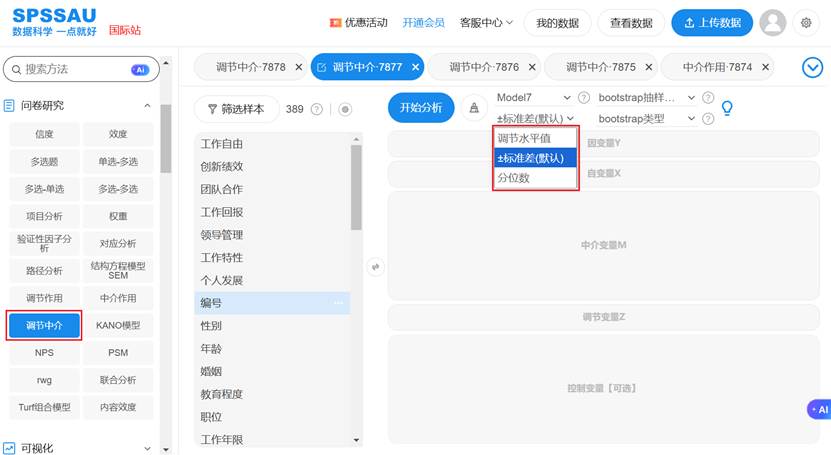 工具的便利性:值得一提的是,像SPSSAU这样的在线统计分析平台,在其 “调节中介(有调节的中介)” 分析模块中,直接内嵌了这两种选择方式。用户在进行分析前,可以在【调节水平】参数处,便捷地选择按 “标准差” 还是按 “分位数” 来设定调节变量的水平值。这种贴心的设计避免了研究人员手动计算临界值的麻烦,也让分析策略能更灵活地匹配数据特性和研究问题。