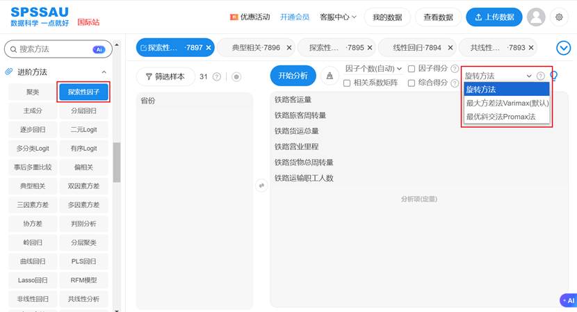 SPSSAU作为一款用户友好的在线统计分析工具,简化了因子分析的过程,包括旋转方法的选择。以下是一个简要的操作示例,展示如何在SPSSAU中应用最大方差法和最优斜交法。