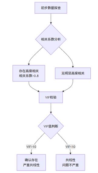 该流程体现了从简单到复杂的递进诊断思路,首先通过相关系数矩阵初步筛查,进而利用方差膨胀因子(VIF)等指标精确量化共线性程度,最终形成综合判断。