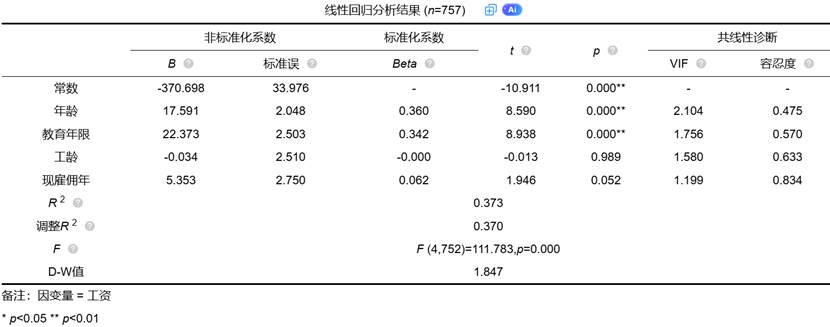 - 年龄(B=17.591):在控制其他因素不变的情况下,年龄每增加1岁,工资平均增加17.591货币单位。这是一个实际效应量,对于政策制定和薪酬规划具有直接参考价值。