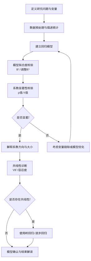 上图展示了多元线性回归的典型分析流程。从问题定义开始,经过数据准备、模型建立、拟合度检验、系数显著性判断,再到共线性诊断与处理,最终完成模型确认与结果解读。这一流程体现了回归分析的系统性与逻辑性,也提示我们在分析中需逐步验证模型的合理性。
