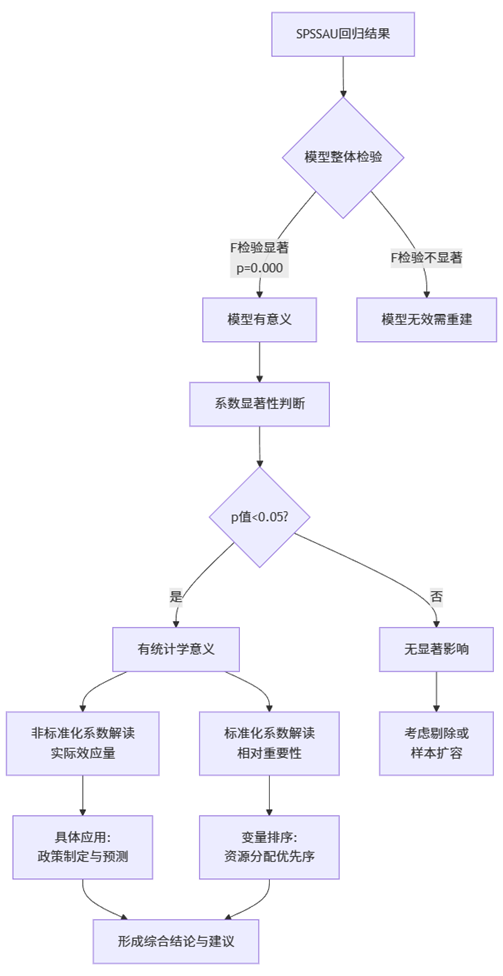 上图展示了回归分析结果的系统解读流程。从模型整体显著性检验开始,到各个系数的统计显著性判断,再分别从非标准化系数(实际效应)和标准化系数(相对重要性)两个维度进行解读,最后结合实务需求形成综合结论。SPSSAU输出的完整结果为此流程提供了所有必要信息,使分析者能够逐步完成从统计结果到实务见解的转换。