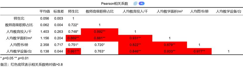 表中可见,“人均教学面积”与“人均设备”的相关系数高达 0.933,明显超过0.8,提示存在强共线性。在输出中,系统会自动用红色标识相关系数大于判断标准的项,方便用户快速定位问题变量。