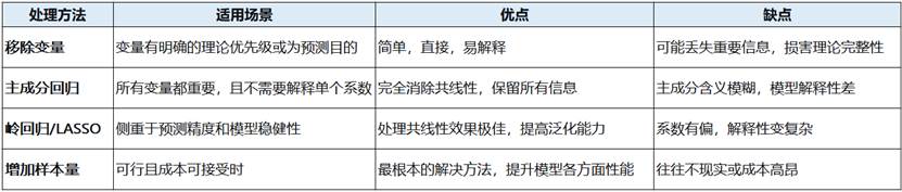 - 发现问题后:优先考虑移除变量,若需保留所有变量,可考虑主成分回归或岭回归。