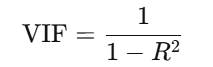 相关系数矩阵只能判断两两之间的共线性,而方差膨胀因子(VIF) 能综合考察某一自变量被其他自变量预测的程度。其公式为: