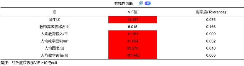 可见,“人均教学设备”的VIF值高达 187.44,远超10的临界值,说明其几乎可以被其他变量完全线性表示。SPSSAU软件会自动计算VIF与容忍度,并对VIF>10或容忍度<0.1的项进行红色高亮,帮助研究者快速识别问题变量。