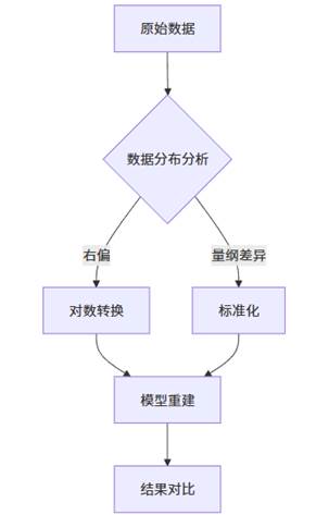 该流程首先分析数据分布特征,针对右偏或量纲差异问题选择变换方法。SPSSAU的“数据转换”模块提供对数、标准化等一键操作,并自动生成变换前后分布对比图,辅助判断必要性。
