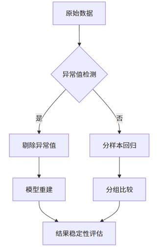 该流程从数据清洗开始,通过异常值检测决定是否剔除极端样本。若数据质量良好,则按关键特征分组回归,最终通过系数对比评估稳健性。SPSSAU的“异常值检测”模块可自动生成箱线图与Z-score分析报告,辅助决策。