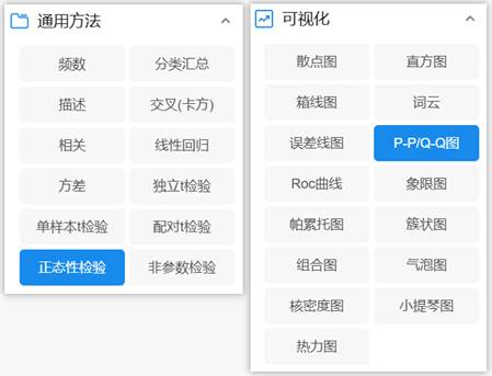SPSSAU操作:在SPSSAU的“可视化”栏目中,你可以轻松绘制残差的直方图、P-P图或Q-Q图。同时,在“通用方法”的“正态性检验”中,将残差项拖入分析框,即可得到S-W或K-S检验的结果。这种一体化的流程设计,极大地简化了我们的诊断工作。
