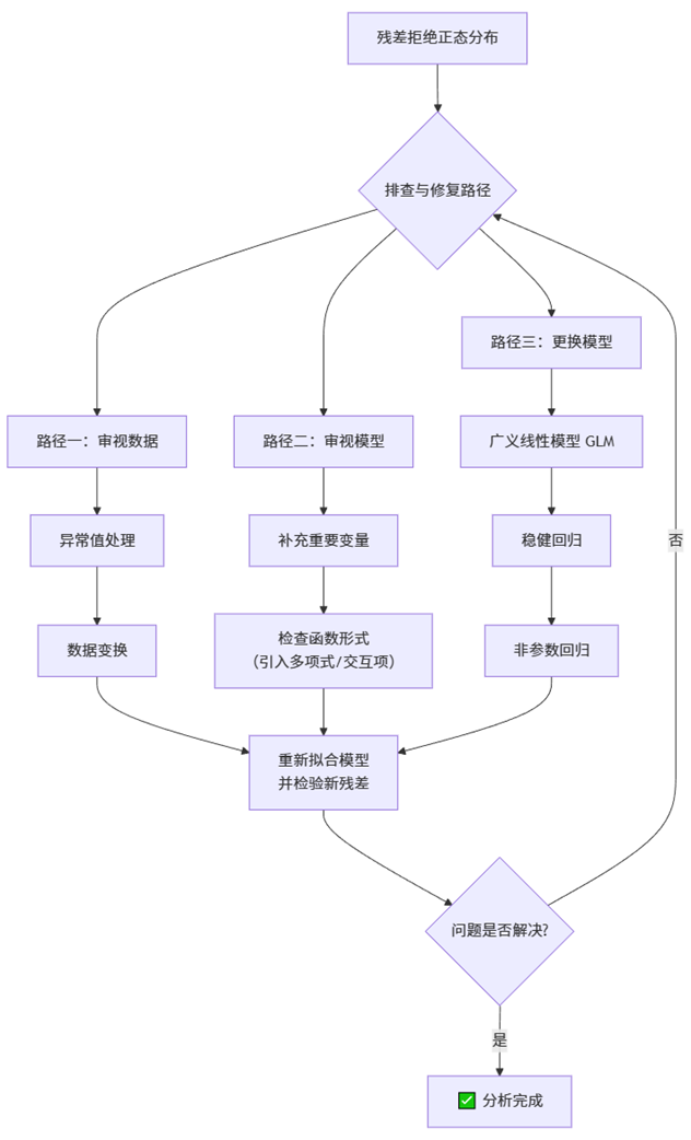 面对回归模型中残差不服从正态分布的问题,我们绝不应束手无策或视而不见。一个严谨的数据分析师应当像一位侦探,遵循一套系统的流程: