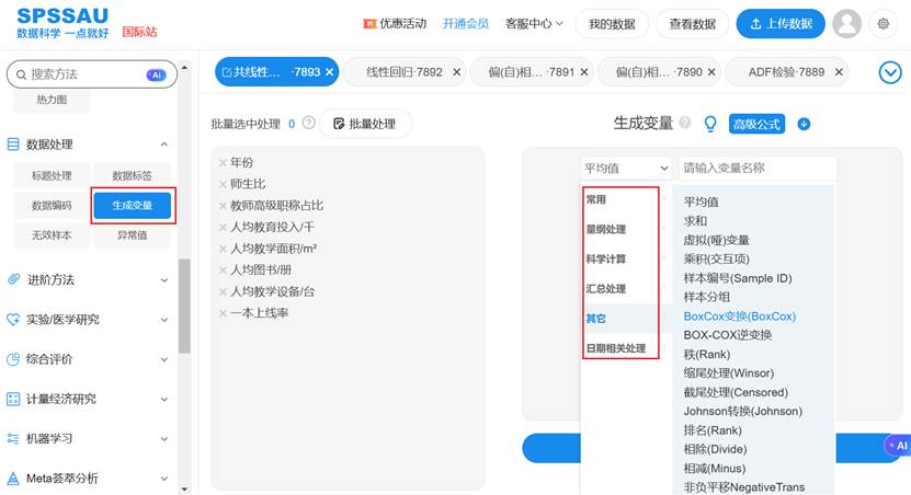 - Box-Cox变换:一种自动选择最佳变换参数的强大方法。它能找到一个λ值,使得变换后的数据 (Y^λ - 1)/λ 最接近正态分布。SPSSAU【生成变量】算法可以一键生成变换后的新变量,非常方便。