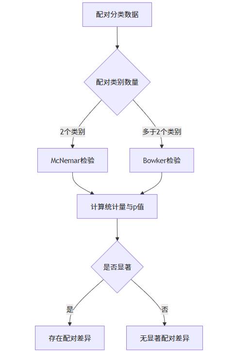 配对卡方检验方法选择流程图如下:根据配对变量的类别数量选择相应的统计方法,SPSSAU自动识别数据类型并执行合适的检验。